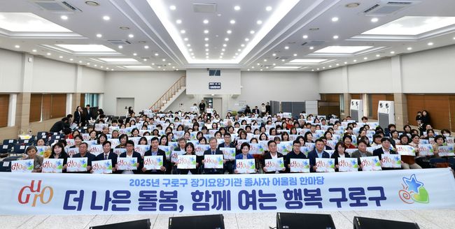`2025년 구로구 장기요양기관 종사자 어울림 한마당` 참석자들이 기념촬영을 하고 있다.2일 서울 구로구(구청장 장인홍)는 1월부터 관내 장기요양기관에 종사 중인 요양보호사를 대상으로 보수교육비 지원 사업을 시행한다고 밝혔다. 이번 사업은 서울시 자치구 가운데 최초로 도입되는 제도다.