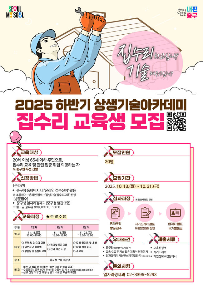 서울 중구, ‘상생기술아카데미 집수리 교육’ 참여자 모집 - 11월 중 3일간 실습 중심의 생활 집수리 기술 교육 진행 - 중구민 우선 선발…취·창업 희망 주민에 기술 습득 기회 제공 - 도배·전기배선·목공 등 실무 중심 교육으로 자립 역량 강화