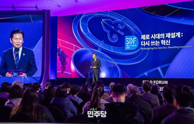 정청래 당대표가 2025.11.13.(금) 서울 동대문구에 위치한 DDP에서 열린 SBS D포럼 2025에 참석하여 축사를 하고 있다.