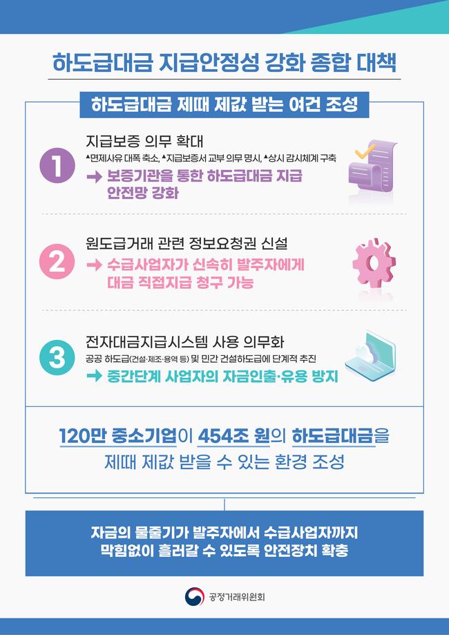 공정거래위원회가 11월 21일 중소 하도급업체가 제때 정당한 하도급대금을 지급받을 수 있도록 지급보증기관·발주자·전자대금지급시스템을 중심으로 한 ‘하도급대금 지급안정성 강화 종합 대책’을 발표했다.