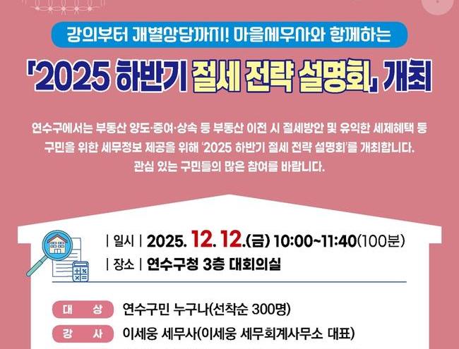 연수구(구청장 이재호)는 다음 달 12일(금) 오전 10시부터 구청 대회의실에서 유용한 세무 정보를 제공하는 `2025 하반기 절세 전략 설명회`를 연다.