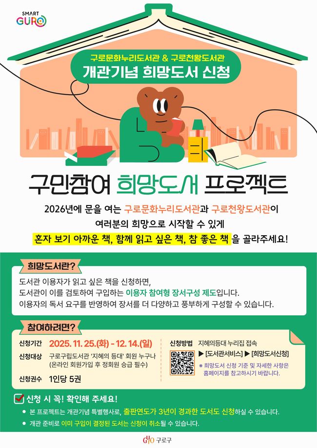 구로구, 주민이 만드는 ‘희망도서 프로젝트’ 추진 - 주민이 직접 신청하는 장서 구성 방식 도입 - 도서관 개관 기념해 신청 권수·기준 완화 - 온라인 신청 절차 개선으로 참여 확대 기대